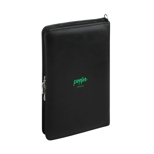 Стильный аксессуар из премиальной кожи выполнен в черном цвете и украшен вышитым изображением, вдо..