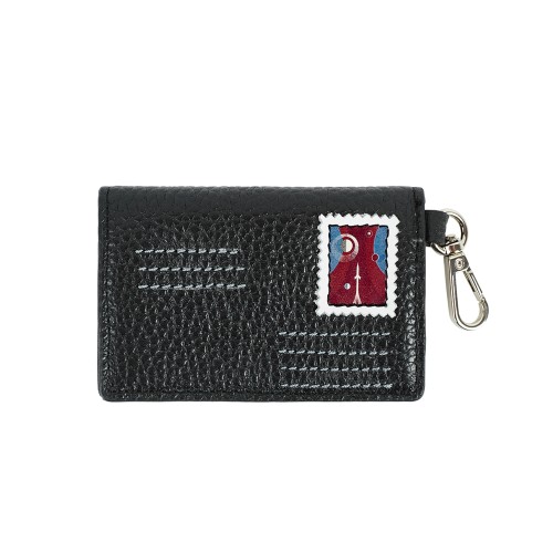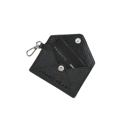 Оснащена металлическим карабином, с помощью которого карточницу можно закрепить в сумке, на ключах или за шлёвку джинс.