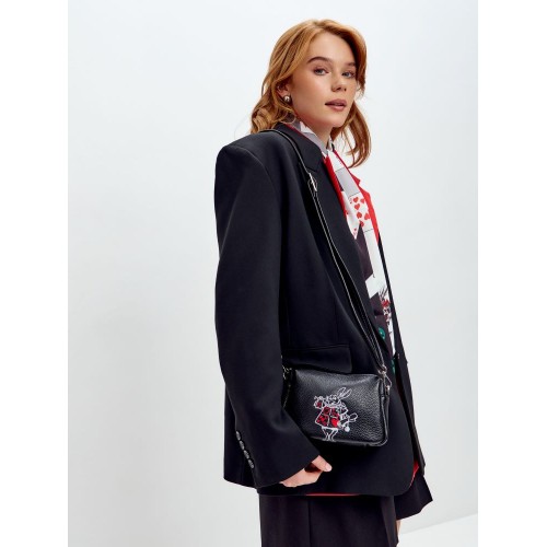 Стильный аксессуар из премиальной кожи выполнен в черном цвете и украшен вышитым изображением, вдохн..