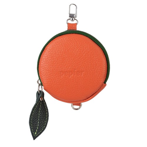 Многофункциональная круглая подвеска-портмоне Мандарин с карабином, петелькой и застежкой-молнией. Модель из премиальной кожи оранжевого цвета и зеленым листиком. Логотип PEPFER. Металлическая фурнитура с никелевым покрытием.