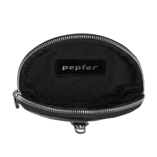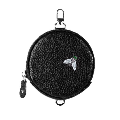 Многофункциональная круглая подвеска-портмоне с карабином, петелькой и застежкой-молнией. Модель из премиальной кожи черного цвета. Объемный рисунок – вышивка "МУХА". Логотип PEPFER. Металлическая фурнитура с никелевым покрытием.