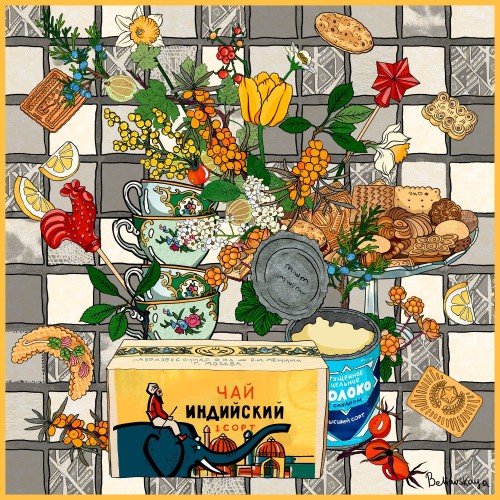 Индийский чай, сгущёнка, печенье, леденец «Петушок на палочке» – продукты, вызывающие ассоциации с домашним теплом и традиционными угощениями.