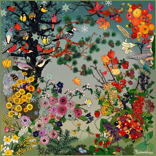 Платок «ВРЕМЕНА ГОДА» — оригинальный платок из натурального шелка с авторским принтом. Размер 90 × 90 см. Необычный дизайнерский аксессуар, который добавляет образу иронии, цвета и индивидуальности. Подходит для повседневных и акцентных образов, легко стилизуется на шее, голове, сумке или в одежде.
