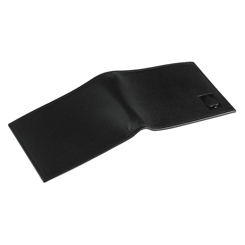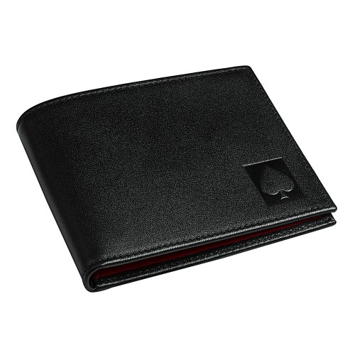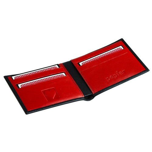 Натуральная кожа. Снаружи — глубокий чёрный, строгий и спокойный. Внутри — яркий красный, цвет энергии и денег.