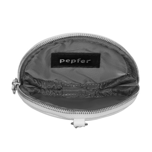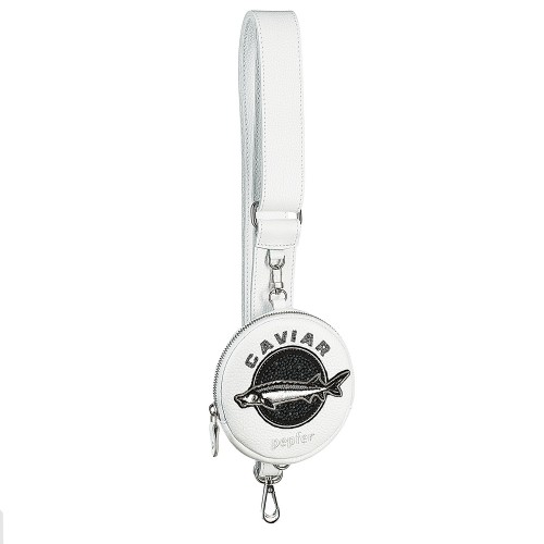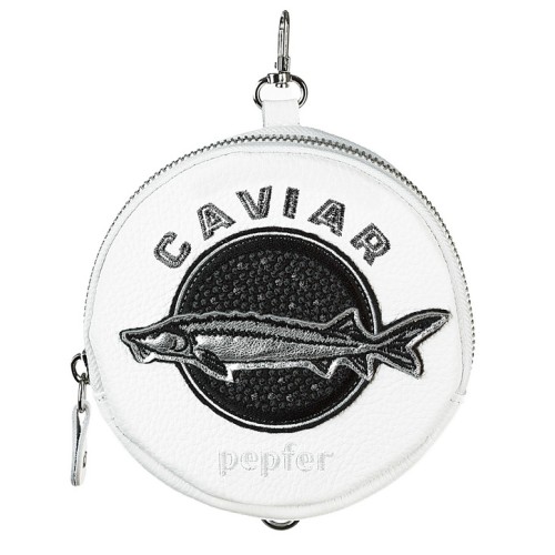 Многофункциональная круглая подвеска-портмоне с карабином, петелькой и застежкой-молнией. Модель из премиальной кожи белого цвета. Объемный рисунок ИКРА вышит по оригинальному дизайну студии PEPFER. Металлическая фурнитура с никелевым покрытием.