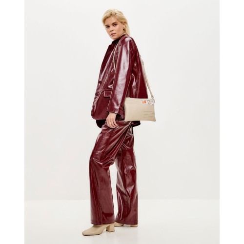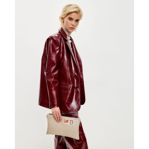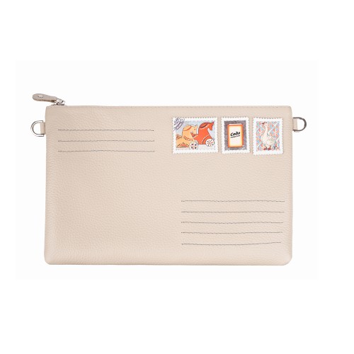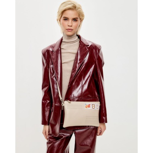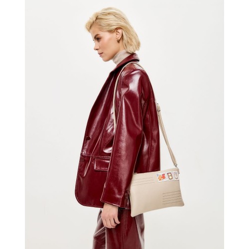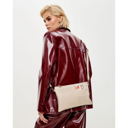 Эта оригинальная модель ,бежевого цвета сделана из натуральной кожи с аппликацией марки по иллюстрации современной художницы Кати Белявской.