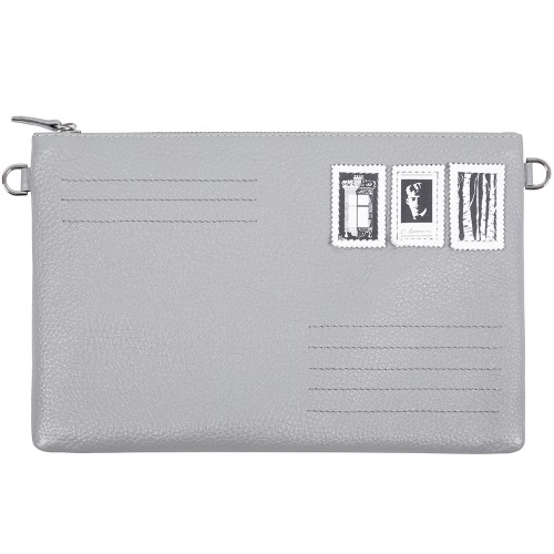 Оригинальная сумка серого цвета из натуральной кожи с аппликацией марки, посвящённой 130-летию Сергея Есенина.
