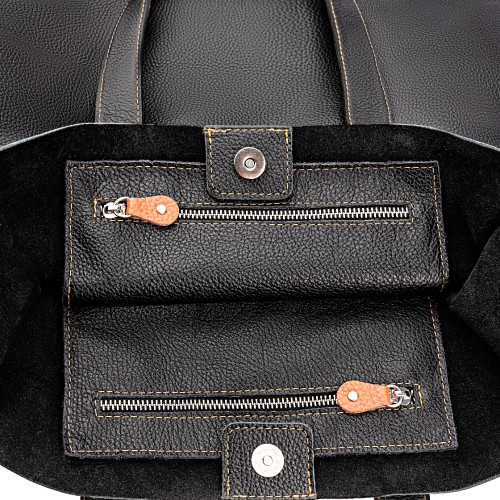Сумка закрывается на большую магнитную кнопку. Внутри расположены два кармана на молнии для документов и мелких предметов.