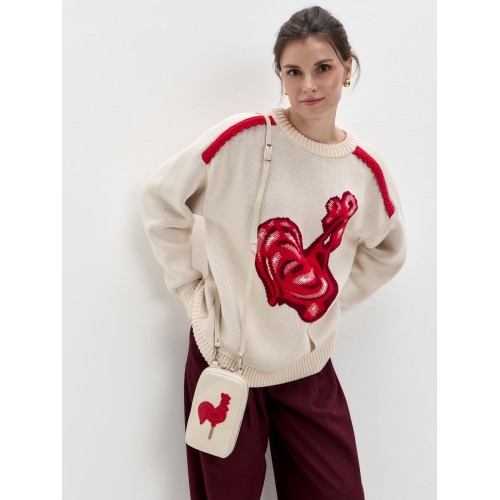 Главный герой знакомый каждому петушок. Связанный объёмно, он будто слегка тает, как настоящий леденец, оставляя ощущение тепла, игры и радости. Вещь, которая сразу вызывает улыбку и цепляет взгляд.