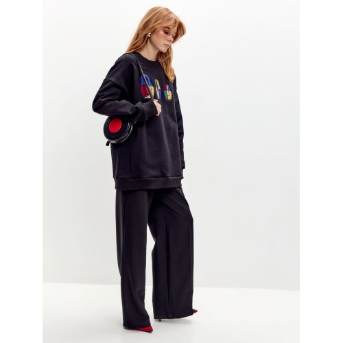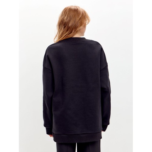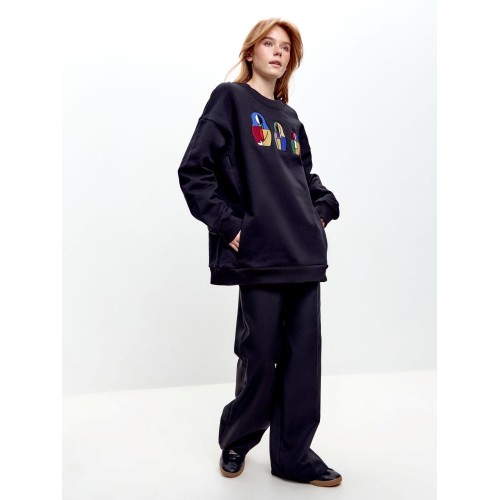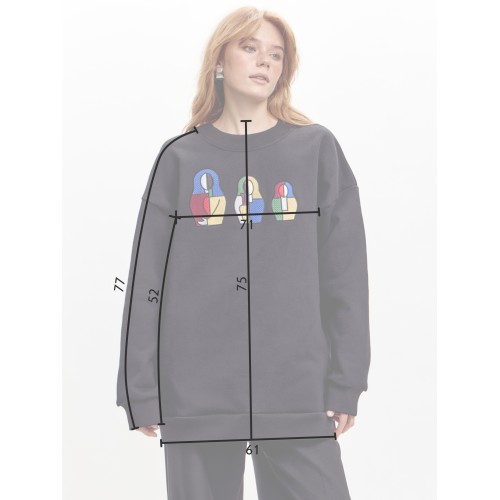 Свитшот выполнен в свободном силуэте oversize, что обеспечивает комфортную посадку и универсальность.